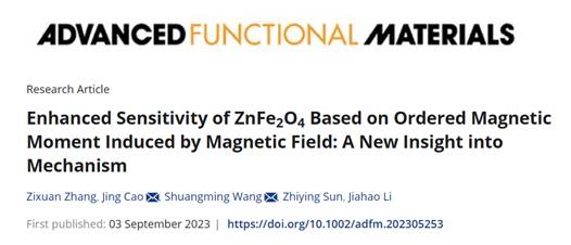 德赢winac米兰曹静课题组近期在《Advanced Functional Materials》发表题目为Enhanced Sensitivity of ZnFe2O4 Based on Ordered Magnetic Moment Induced by Magnetic Field: A New Insight into Mechanism的研究成果。该工作的第一作者为硕士研究生张子瑄,曹静和王双明为该论文的通讯作者。