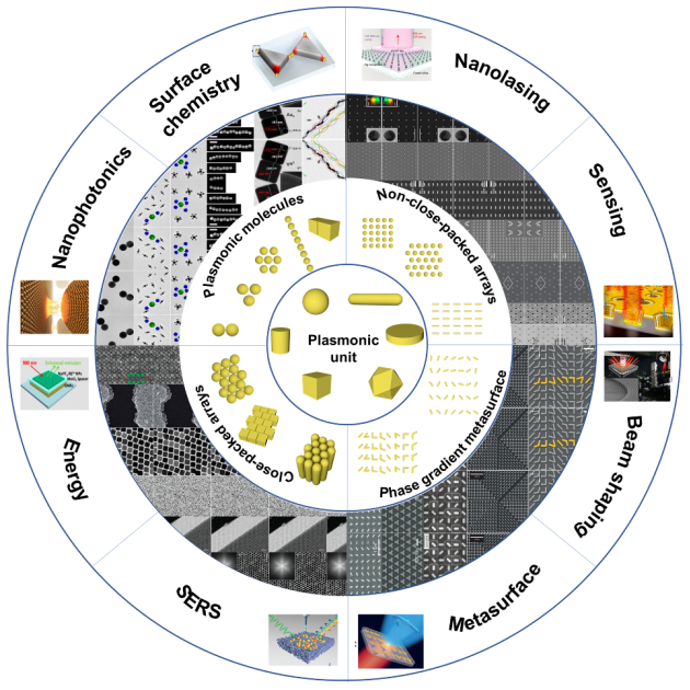 图1. 等离激元超表面光与物质相互作用、制备方法以及应用的示意图。